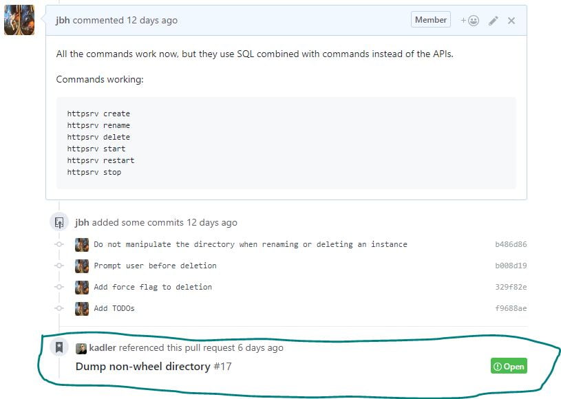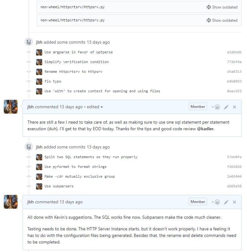After taking Kevin’s reviews into consideration and deciding they all had merit, I made the recommended changes and committed them to the new-script/httpcrtsrv branch and pushed them out to GitHub . Remember that anything committed to the branch in the PR will update the PR. In the above screenshot, we can see that my commits and the comments are shown in order within the PR. If you read further in the PR, you’ll see that Kevin continued to review, and the code was continuously improved throughout the cycle until the PR was ready. Keep in mind that anyone with permission could be making these commits, and they’ll update the PR as well.