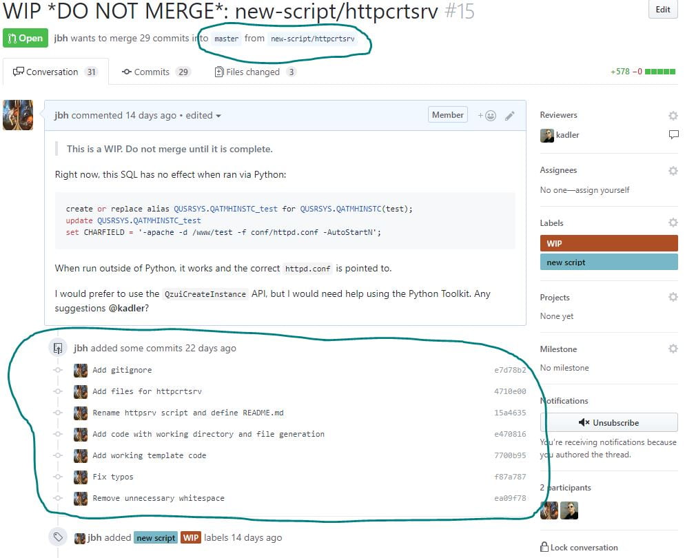 This screenshot shows my initial comment and commits of the PR. I’ve circled the merged branches and initial commits. I named the branch in a “semantic” manner, which is my way of saying I adopted a convention of prefixing branch names with a descriptive name such as “new-script,” “hotfix,” “feature,” or “bug.”